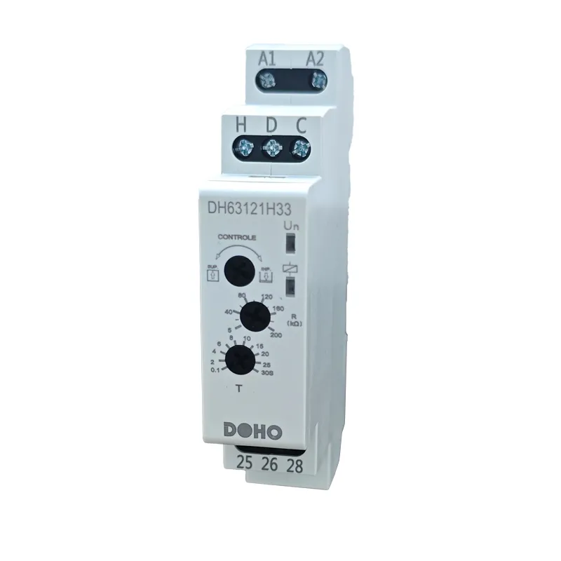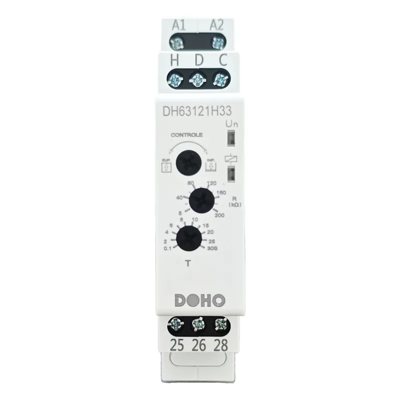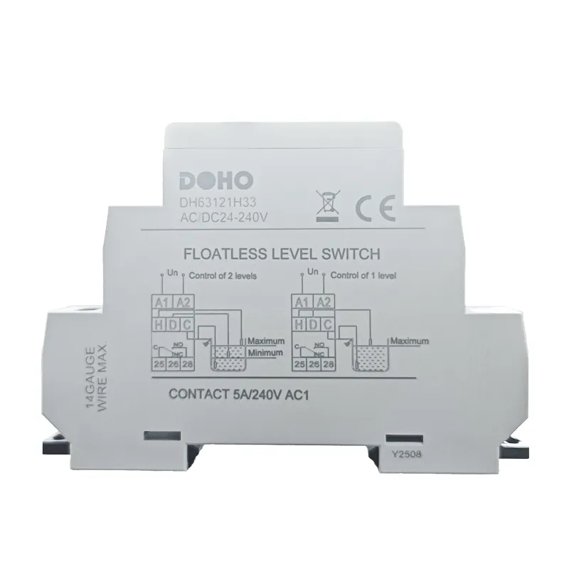 Многофункциональное реле контроля уровня жидкости DOHO DH63121 — это интеллектуальное устройство управления, предназначенное для систем очистки сточных вод и бытового водоснабжения. Оно работает по основному принципу контроля проводимости жидкости и объединяет два режима управления — первичный и вторичный — для обеспечения точного управления уровнем жидкости в различных сценариях.Это реле имеет регулируемую чувствительность, что позволяет настраивать точность обнаружения в зависимости от чистоты жидкости (например, чистая вода, слегка загрязненные сточные воды). Оно определяет изменения уровня жидкости через точки обнаружения, такие как H (высокий уровень) и D (низкий уровень), и включает в себя логику задержки включения для эффективной фильтрации помех от колебаний поверхности.Устройство использует контактные выходы SPDT с номинальным током 5 А, подходящие для малых и средних водяных насосов. Режим питания охватывает как диапазон одного напряжения (от 110 В переменного тока до 24 В постоянного тока), так и широкий диапазон напряжений (24–240 В переменного/постоянного тока). Это позволяет ему выполнять основные требования к управлению небольшими бытовыми резервуарами для воды, а также подходить для сценариев вторичного многоуровневого управления промышленными резервуарами среднего размера. Установка проста и не требует ручного контроля.
