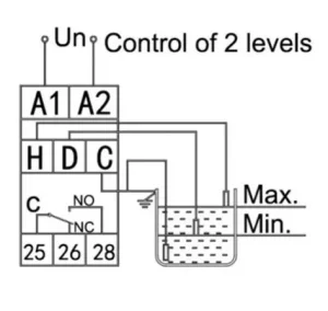 Двухступенчатое автоматическое управление подачей воды (с задержкой) Когда уровень жидкости опускается ниже D, начинается период задержки; по его окончании включается реле. Когда уровень жидкости поднимается до H, период задержки заканчивается и реле отключается, повторяя этот цикл.