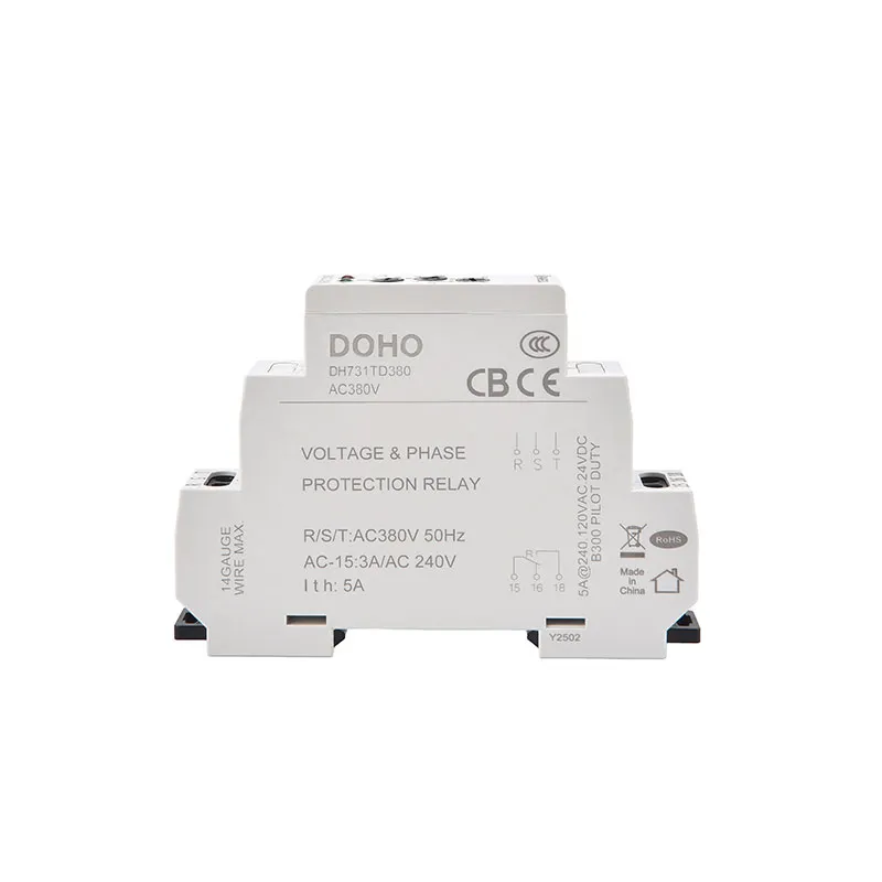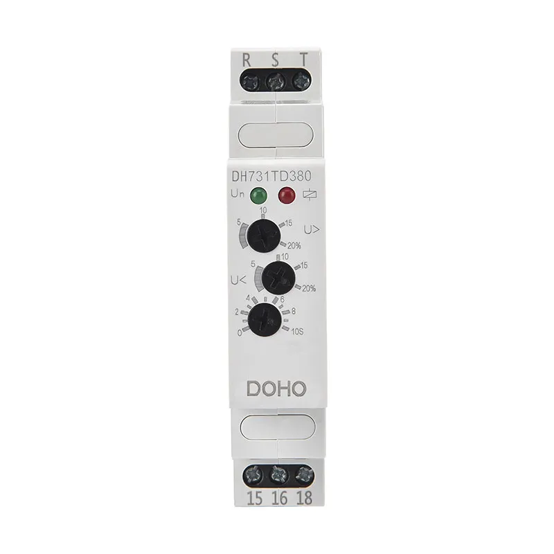 DOHO DH731TD380 трехфазное, трехпроводное реле защиты напряжения – это интеллектуальное устройство защиты с гибкой функцией регулировки задержки, в основе которого лежит высокоскоростной и маломощный процессор для построения схемы мониторинга, и оно подходит для трехфазной, трехпроводной системы электропитания с характеристиками от 220VAC до 440VAC.