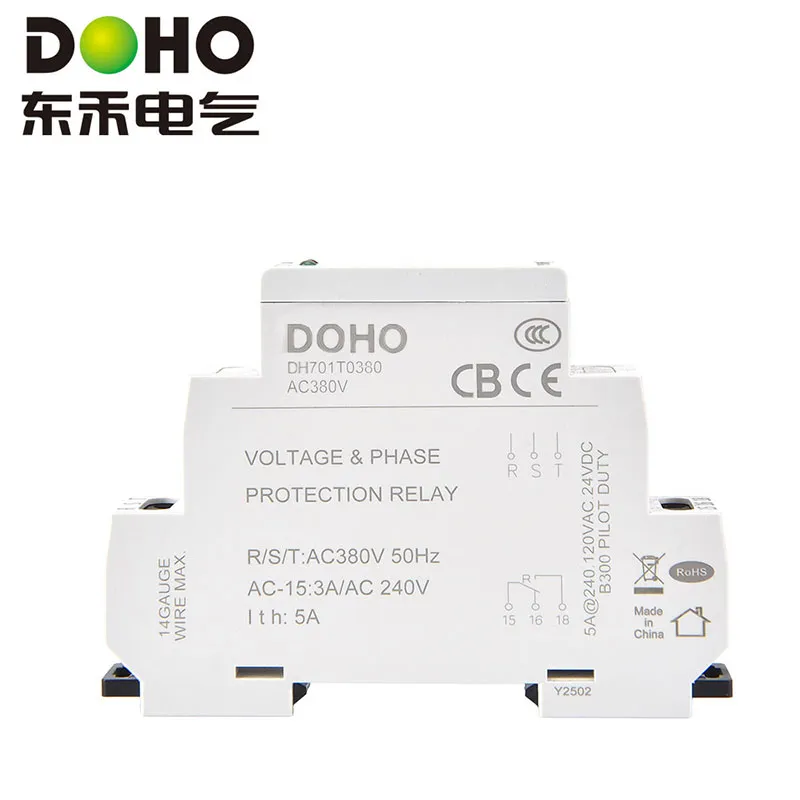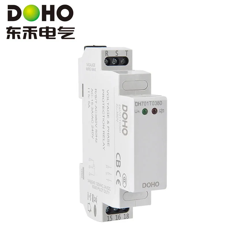Трехфазное трехпроводное реле защиты напряжения DOHO DH701T0380 — это универсальное устройство защиты линии, совместимое с несколькими спецификациями напряжения (от 220 В переменного тока до 440 В переменного тока). В его основе лежит высокоскоростной процессор с низким энергопотреблением, который обеспечивает точность системы мониторинга.